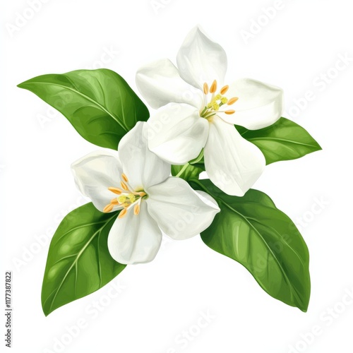 © Mandeep, Fototapeta premium two white flowers with green leaves