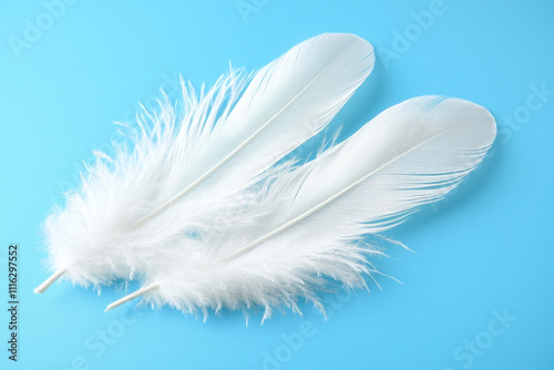© Fiva, Obraz premium Two white fluffy feathers on a light blue background.