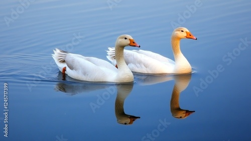 © Yeivaz, Fototapeta premium Two White Geese Reflecting on Calm Water