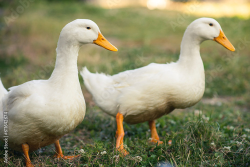 Obraz premium Two white geese stand on green grass. Poultry, breeding geese. Rural background.