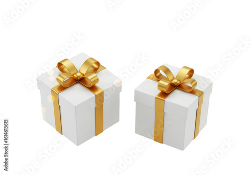 © Vooglo.com, Obraz premium Two white gift boxes with gold ribbon and bows isolated on a transparent background