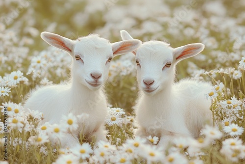 © Alexandr, Fototapeta premium Two white goats in field of daisies