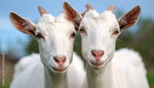 © Clipora, Fototapeta premium Two White Goats Smiling in Sunlight on Farm