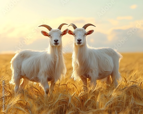 © Bussakon, Obraz premium Two white goats stand in a golden wheat field at sunset