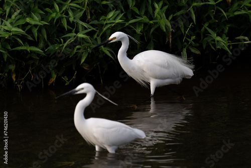 © imphilip, Obraz premium Two white great egrets standing in the water, dark background
