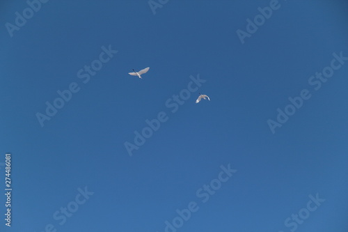 Fototapeta premium Two white herons are flying against the blue sky