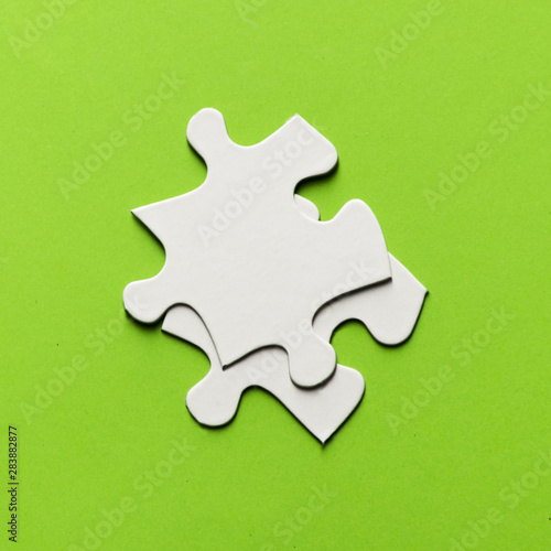 Fototapeta premium Two white jigsaw puzzle piece on bright green backdrop