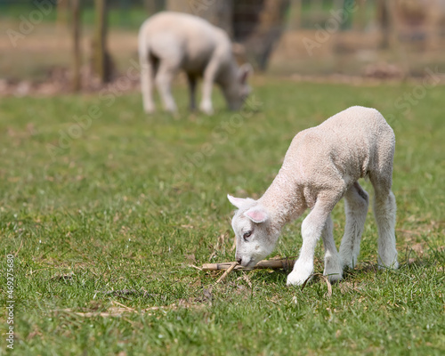 Obraz premium Two white lambs in the meadow grazing