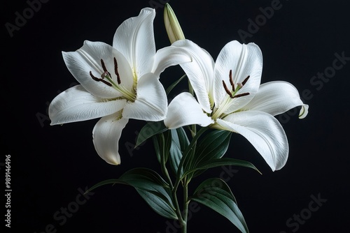 © Outkast, Fototapeta premium Two White Lilies with Green Stem and Leaves on a Black Background