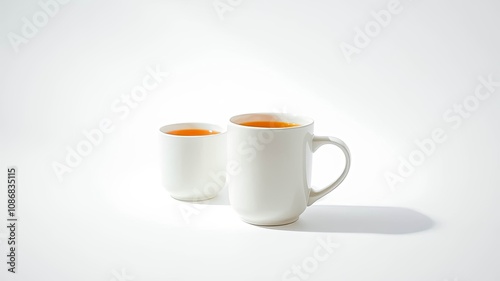 © Ole Studio, Obraz premium Two white mugs filled with a warm beverage, one with a handle, on a white background with a slight shadow under the mug with the handle