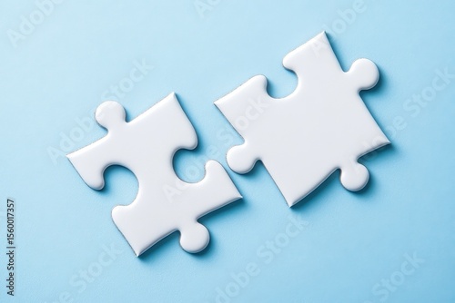 Obraz premium two white puzzle pieces matching together againt light blue background, Two white puzzle pieces interlocking against a light blue backdrop, representing collaboration and harmony