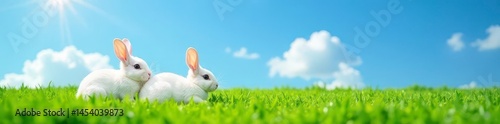 Fototapeta premium Two white rabbits rest on vibrant green grass, sunny blue sky , stock photo,...