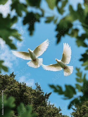 © Generative AI, Obraz premium Two white s flying in blue sky surrounded by green leaves and trees