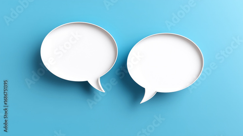 Fototapeta premium Two white speech bubbles on a blue background, communication bubbles, blue design, conversation theme, modern messaging, simple dialogue
