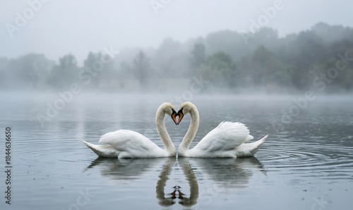 Fototapeta premium Two White Swans Forming a Heart Shape on Misty Lake. Romantic Wildlife Scene in Foggy Morning. Perfect for Valentine’s Day and Love Concepts
