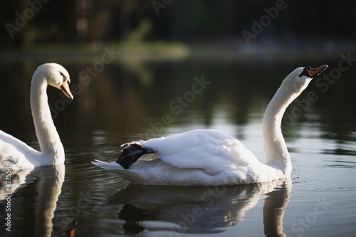 © Наталья Бирюкова, Fototapeta premium two white swans swim on the pond
