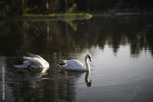 © Наталья Бирюкова, Fototapeta premium two white swans swim on the pond