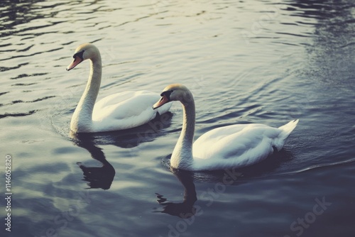 Obraz premium Two white swans swimming together in calm water