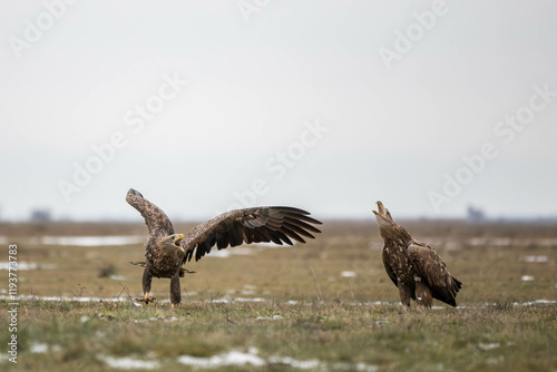 Obraz premium two white tailed eagles on the ground, they seem to be shouting at each other