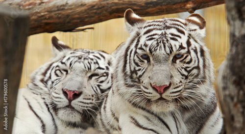 © Zsolt Biczó, Fototapeta premium Two white tigers rest together