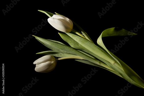 Fototapeta premium Two white tulips in full dark under studio lighting