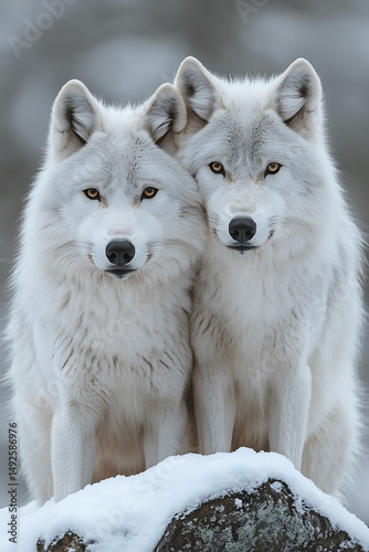 © Arnikaa, Obraz premium Two white wolves on snowy rock