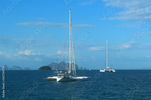 © Сергей Храмов, Obraz premium Two white yachts in the blue sea against the blue sky.