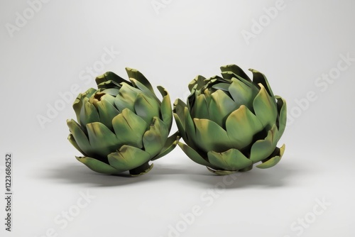 © darshika, Obraz premium Two whole artichokes with green and yellow hues sit on a white surface.