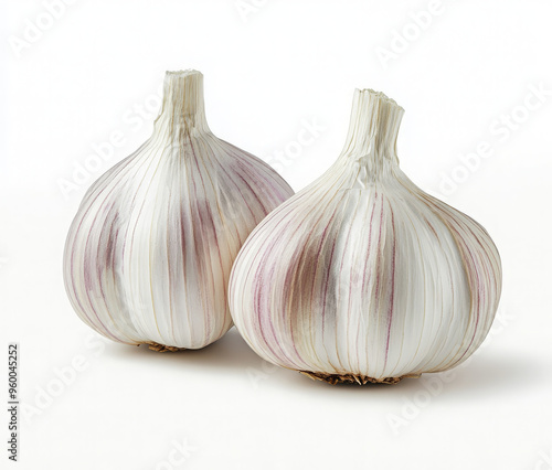 © SejutaCahaya, Obraz premium Two whole garlic bulbs with purple stripes, isolated on a white background.