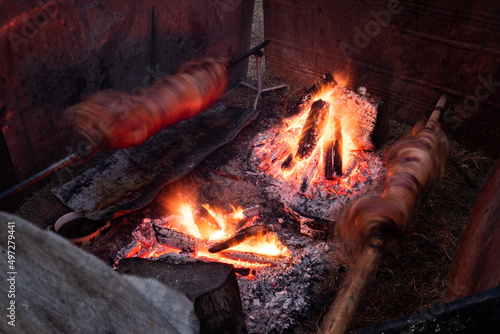 Fototapeta premium Two whole pig roasting on spit next to fire in long exposure