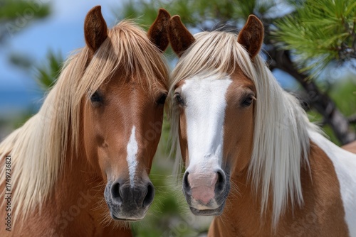 Fototapeta premium two wild horses, chestnut and brown in color with blonde manes, standing side...