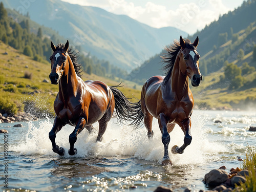 © serkancetinege, Fototapeta premium Two wild horses crossing the river in the valley