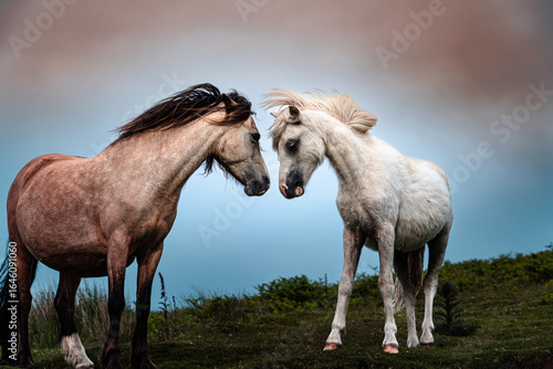 Fototapeta premium Two wild horses, their long manes tangled by the wind and their tails knotted, have hooves worn and cracked from constant running. Yet they are free, living wherever they choose, true creatures of the