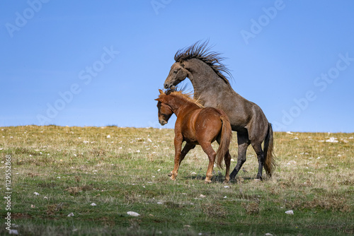 © erikzunec, Obraz premium Two wild male horses fighting on the pasture on the mountain plane Krug over the Bosnian city of Livno