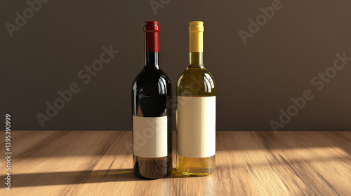 © Rudi, Fototapeta premium Two wine bottles, one red and one white, elegantly displayed on a wooden table, showcasing minimalist design.