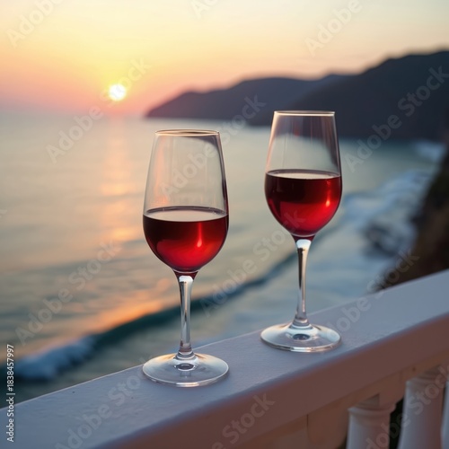 © Pete, Fototapeta premium Two wine glasses filled with red wine stand on a balcony railing. Ocean waves crash below as sun sets over distant hills creating golden hour light.
