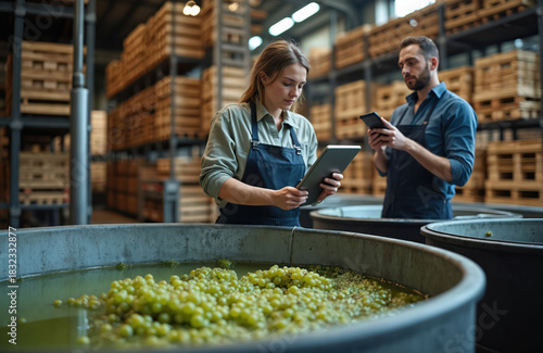 © miss irine, Naklejka premium Two winery workers inspect green grapes in stainless steel tank using digital tablets. Colleagues check drink quality during wine production. Plant employees in aprons work with technology.