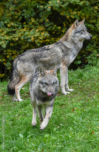 © lisica1, Fototapeta premium Two wolves carrying whole chickens in their mouths