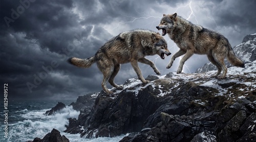 © Mikus, Fototapeta premium Two wolves facing off on a rocky cliff during a stormy night with lightning and turbulent ocean below
