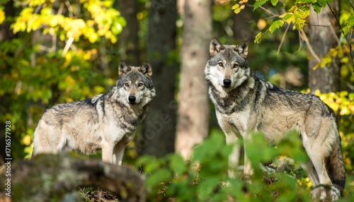 © salwa, Fototapeta premium Two wolves in autumn forest