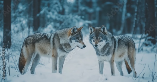 Obraz premium Two Wolves in Cold Winter Forest. Ai generation.