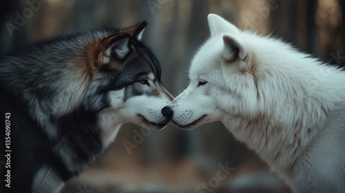 Fototapeta premium Two wolves, noses nearly touching, in a serene forest setting