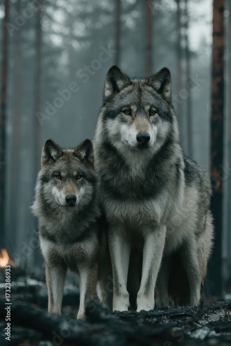 © Veronika, Naklejka premium Two wolves stand together in a misty forest after a wildfire at dusk