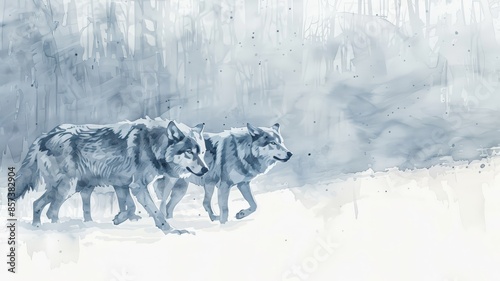 © Mulyadi Lim, Naklejka premium Two wolves traverse a snowy landscape in a serene wintry forest