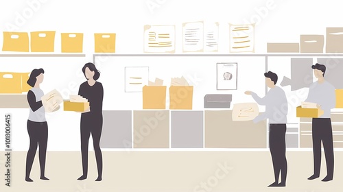 © QITIAN, Fototapeta premium Two women and two men organize paperwork in a bright, modern office environment.