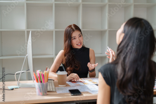 © crizzystudio, Fototapeta premium Two women discussing creative design project in office