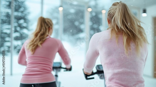 © Larisa AI, Obraz premium Two women engage in a vigorous indoor cycling workout amidst a serene snowy landscape, promoting fitness and friendship in a cozy gym environment.