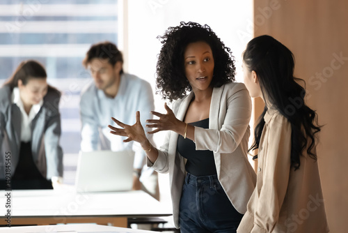 Obraz premium Two women engaged in focused conversation in office, African businesswoman speaking, explains idea or giving instructions to Asian female colleague during teamwork in workplace. Business communication