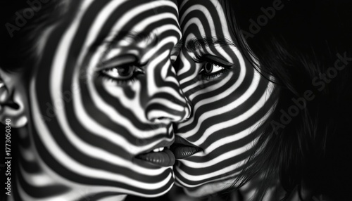 Obraz premium Two women faces with black, white wavy stripes. Optical illusion creates hypnotizing visual effect. Heads close together, showing connection, deep thought, mental focus. Modern art piece features