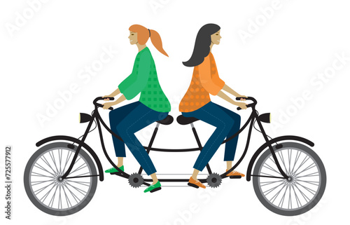© Eva Almqvist, Obraz premium Two women,girls riding same bike in different directions, a metaphor of different goals, argument or disagreement. Tandem bicycle. Isolated. Vector illustration.